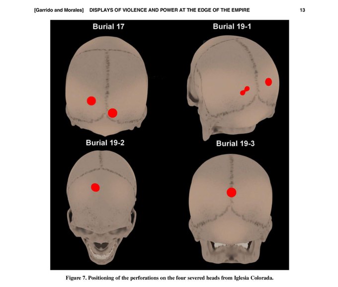 Garrido y Morales estudiaron cuatro cráneos fragmentados y cortados, que datan de la era del horizonte tardío (1476-1532), que eran un misterio tras su hallazgo en 2003. De acuerdo con sus investigaciones, estas cabezas decapitadas tenían orificios en la bóveda del cráneo y marcas en la mandíbula que sugieren que se trataba de cabezas exhibidas como trofeos.